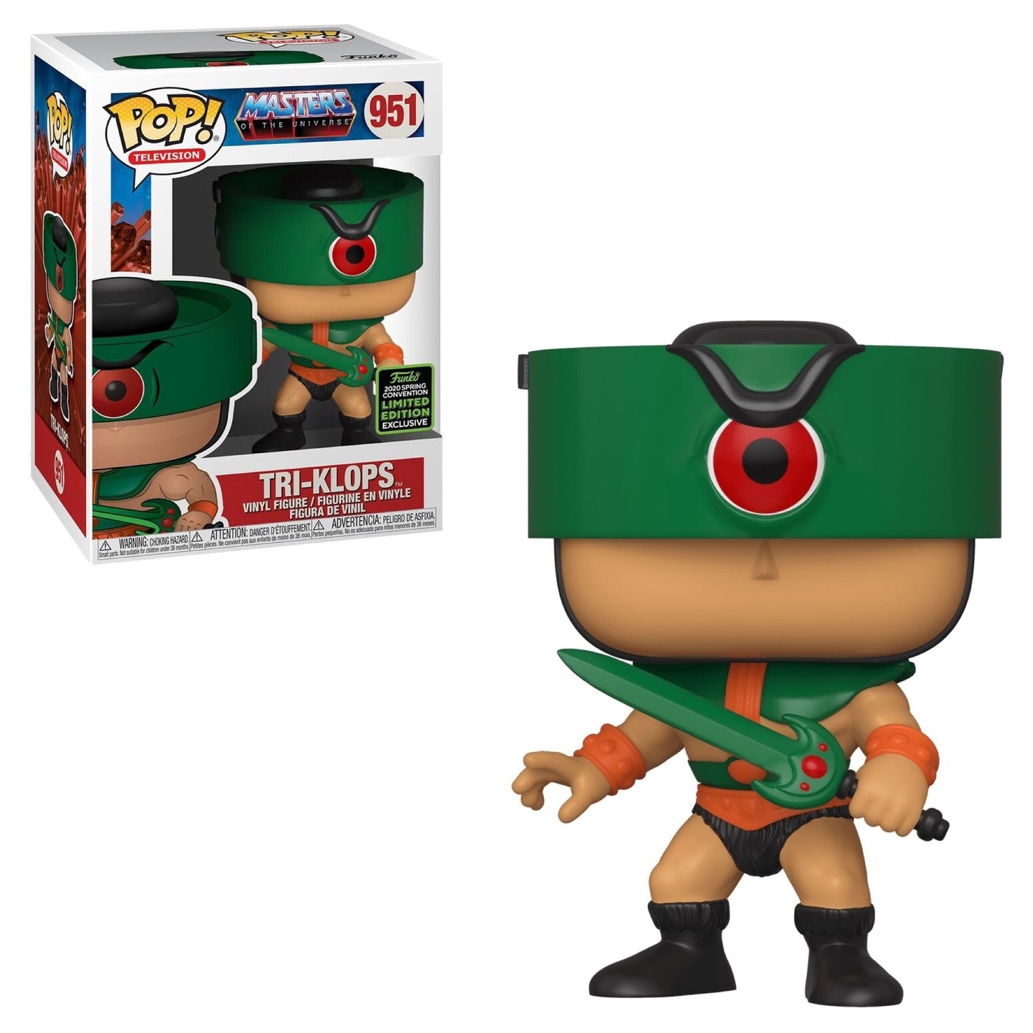 Bring the laser-focused warrior of Eternia to your collection with the Tri-Klops Funko Pop! Vinyl #951, a 2020 Spring Convention Limited Edition from Masters of the Universe. This exclusive Pop! figure captures Tri-Klops in classic MOTU style, complete with his iconic green rotating visor, battle-ready stance, and signature sword.